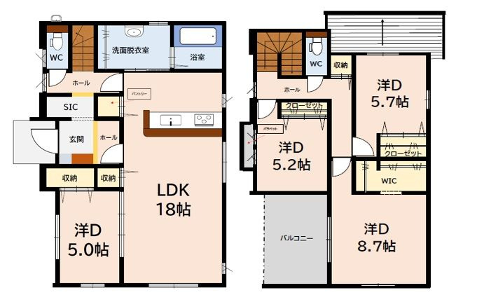 LDK18畳 / 洋5畳 / 洋8.7畳 / 洋5.7畳 / 洋5.2畳 |